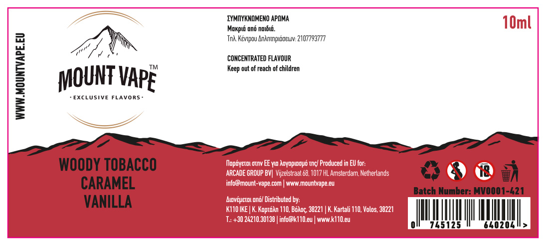 Γεύση καπνού εμπλουτισμένη με νότες καραμέλας και βανίλιας. Το ιδιαίτερο χαρακτηριστικό του MOUNT VAPE WOODY TOBACCO CARAMEL VANILLA 10ML/30ML FLAVORSHOT είναι η ξυλώδης και ταυτόχρονα γλυκιά επίγευση.