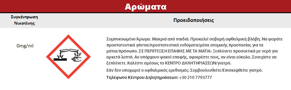 Συστατικά: Συμπυκνωμένο μείγμα αρωμάτων, διαλυμένο σε προπυλενική γλυκόλη (FEMA 2940). Δεν περιέχει ζάχαρη και γλουτένη.