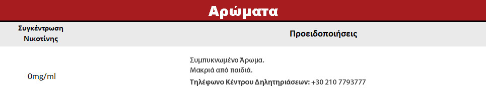 Συστατικά: Συμπυκνωμένο μείγμα αρωμάτων, διαλυμένο σε προπυλενική γλυκόλη (FEMA 2940). Δεν περιέχει ζάχαρη και γλουτένη.