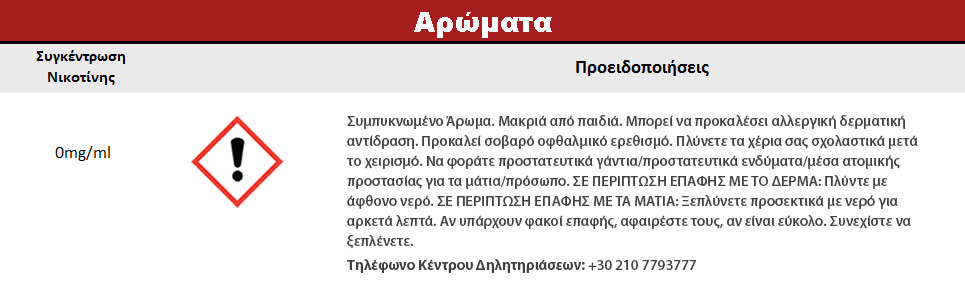 Συστατικά: Συμπυκνωμένο μείγμα αρωμάτων, διαλυμένο σε προπυλενική γλυκόλη (FEMA 2940). Δεν περιέχει ζάχαρη και γλουτένη.