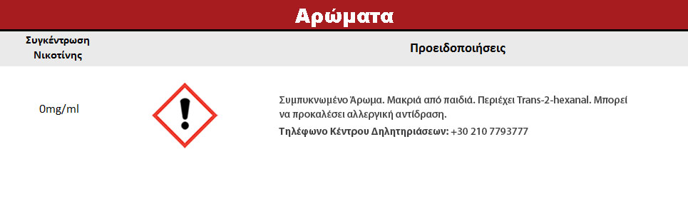 Συστατικά: Συμπυκνωμένο μείγμα αρωμάτων, διαλυμένο σε προπυλενική γλυκόλη (FEMA 2940). Δεν περιέχει ζάχαρη και γλουτένη.