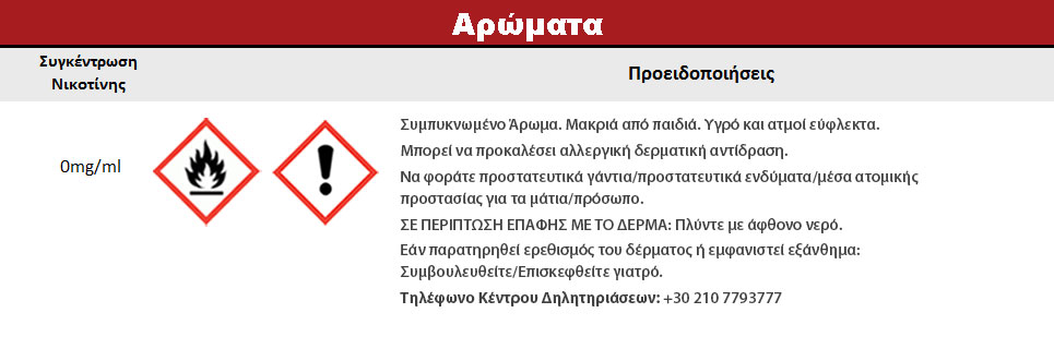 Συστατικά: Συμπυκνωμένο μείγμα αρωμάτων, διαλυμένο σε προπυλενική γλυκόλη (FEMA 2940). Δεν περιέχει ζάχαρη και γλουτένη.