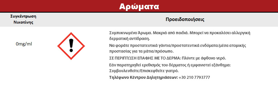 Συστατικά: Συμπυκνωμένο μείγμα αρωμάτων, διαλυμένο σε προπυλενική γλυκόλη (FEMA 2940). Δεν περιέχει ζάχαρη και γλουτένη.