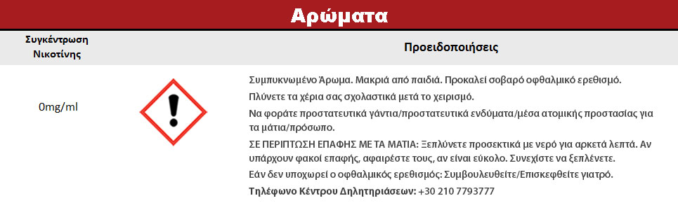 Συστατικά: Συμπυκνωμένο μείγμα αρωμάτων, διαλυμένο σε προπυλενική γλυκόλη (FEMA 2940). Δεν περιέχει ζάχαρη και γλουτένη.