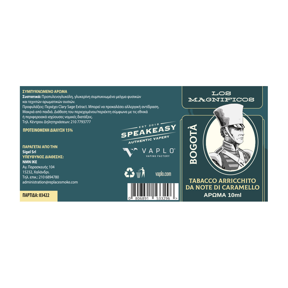 Μια σαγηνευτική ζωτικότητα, μια βαθιά ψυχή που ξετυλίγεται μεταξύ των τοίχων και των δρόμων της υπέροχης μητρόπολης των Άνδεων: χρώμα και μουσική, αυτή είναι η Μπογκοτά η πρωτεύουσα της Κολομβίας. To συμπυκνωμένο άρωμα Speakeasy Bogota 10ml Flavor θα σας εκπλήξει με το υπέροχο άρωμα του από αυθεντικό καπνό και γλυκιά επίγευση καραμέλας.